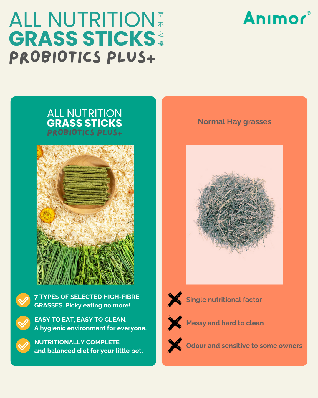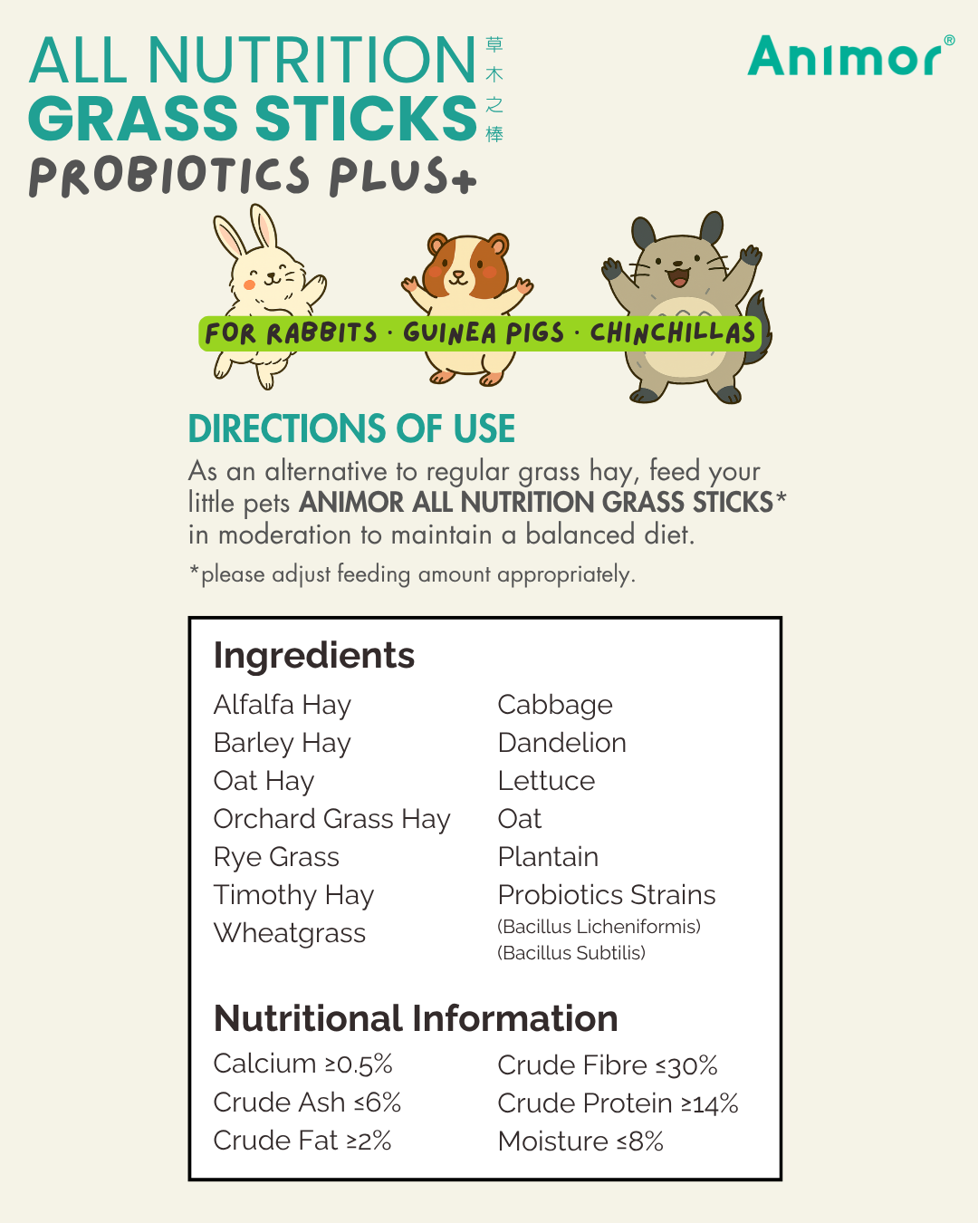 Made from a blend of seven high-fiber grasses, the New formula is adjusted to international nutritional standards for small animals.