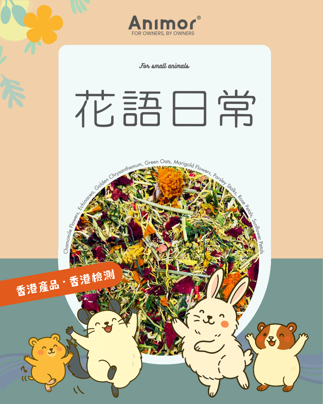 配方以甘菊、金絲皇菊和萬壽菊的溫和特性,幫助放鬆情緒;紫錐菊與綠燕麥可作日常保養,支持自然抵抗力與腸道健康;歐芹莖提供纖維,有助消化;玫瑰與向日葵花瓣提升適口性並延長啃咬時間。適合灑在主糧與牧草上,為日常飲食增添變化與嗅聞樂趣。