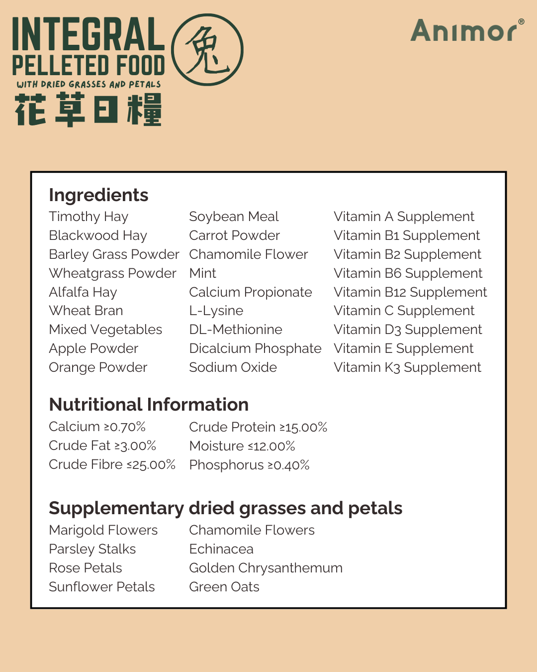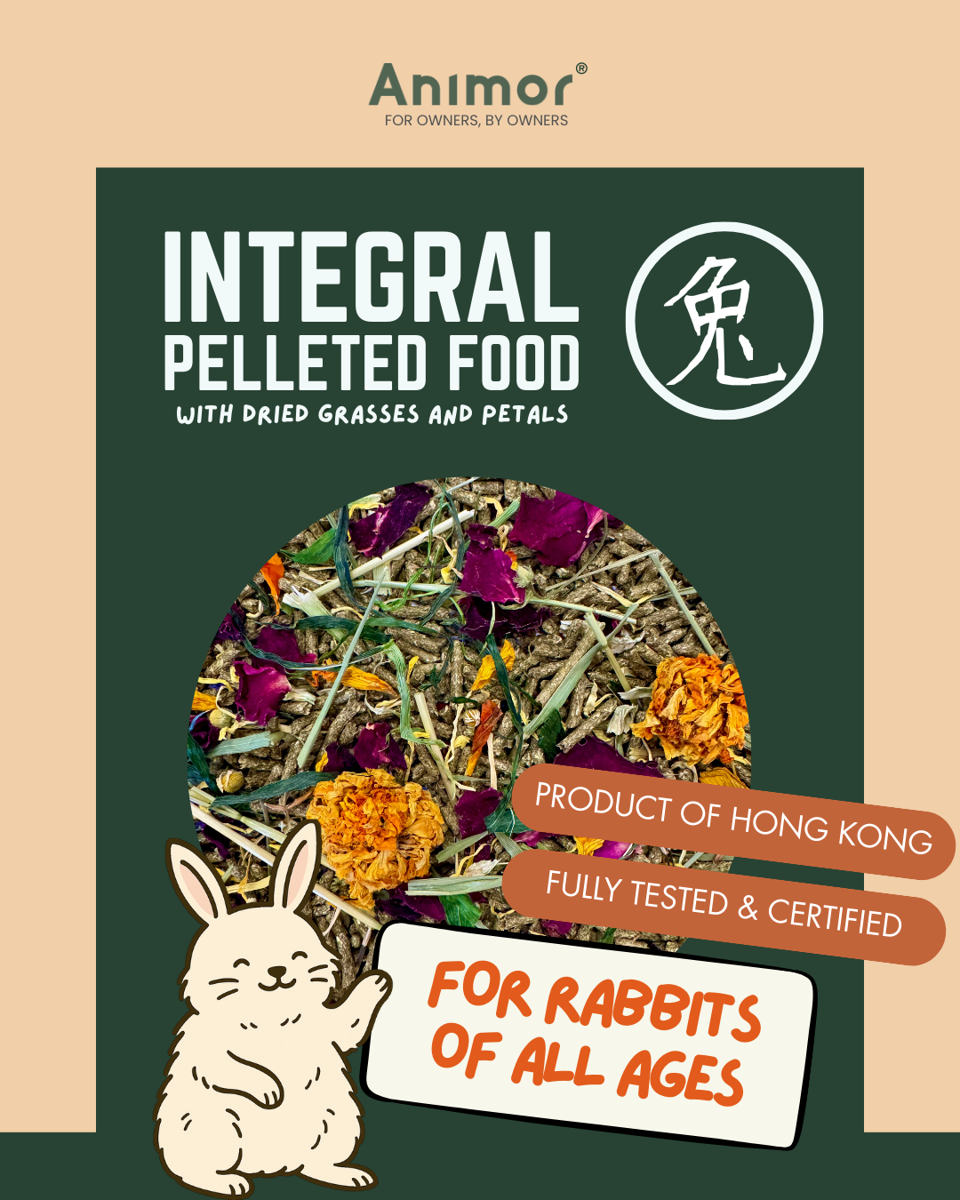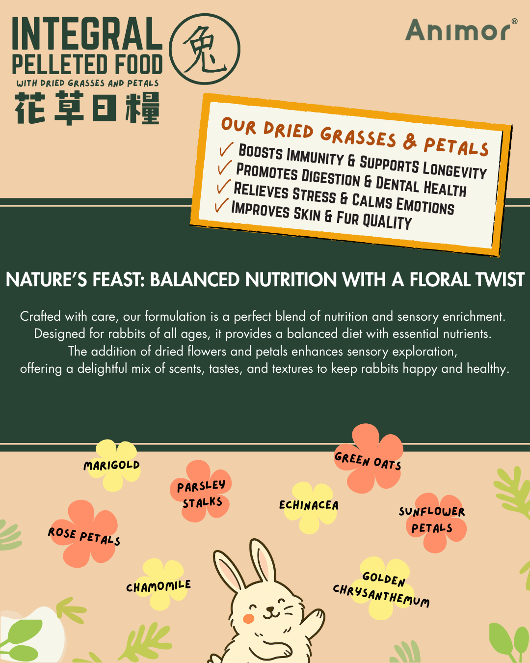 INTEGRAL PELLETED FOOD WITH DRIED GRASSES AND PETALS - FOR RABBITS OF ALL AGES: Specially formulated as a complete daily diet, this balanced food supports vitality, digestive health, and overall well-being while offering rich sensory enjoyment. With Chamomile, Echinacea, Golden Chrysanthemum, Green Oats, Marigold, Parsley Stalks, Rose Petals, and Sunflower Petals, it provides layered natural aromas, flavors, and textures that encourage natural foraging behavior and enjoyment at mealtime.
