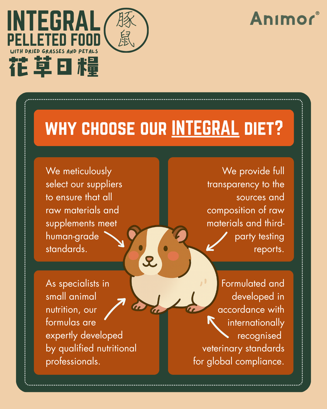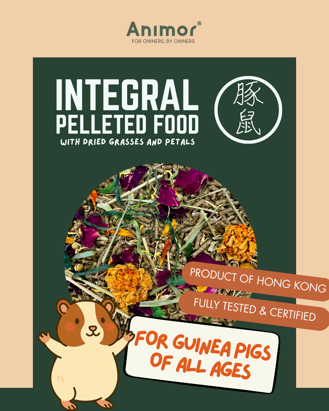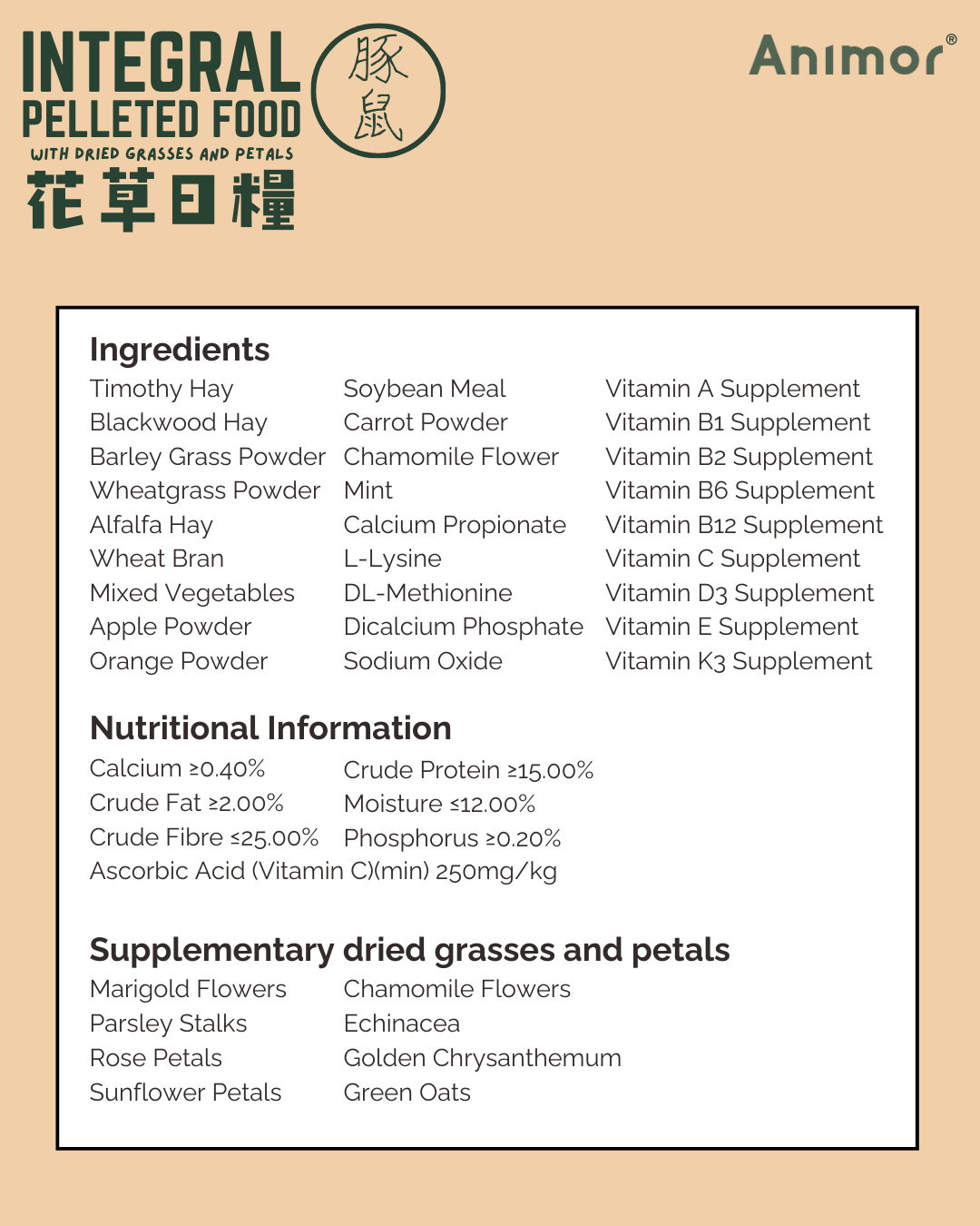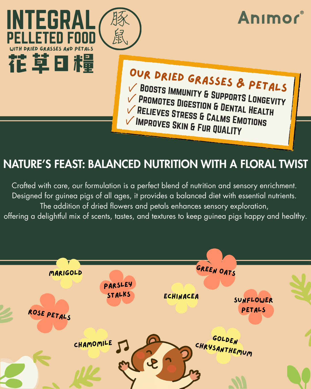 INTEGRAL PELLETED FOOD WITH DRIED GRASSES AND PETALS - FOR GUINEA PIGS OF ALL AGES: Specially formulated as a complete daily diet, this balanced food supports vitality, digestive health, and overall well-being while offering rich sensory enjoyment. Supplemented with vitamin C to support the daily requirement of guinea pigs, and with Chamomile, Echinacea, Golden Chrysanthemum, Green Oats, Marigold, Parsley Stalks, Rose Petals, and Sunflower Petals, it provides layered natural aromas, flavors, and textures that encourage natural foraging behavior and enjoyment at mealtime.